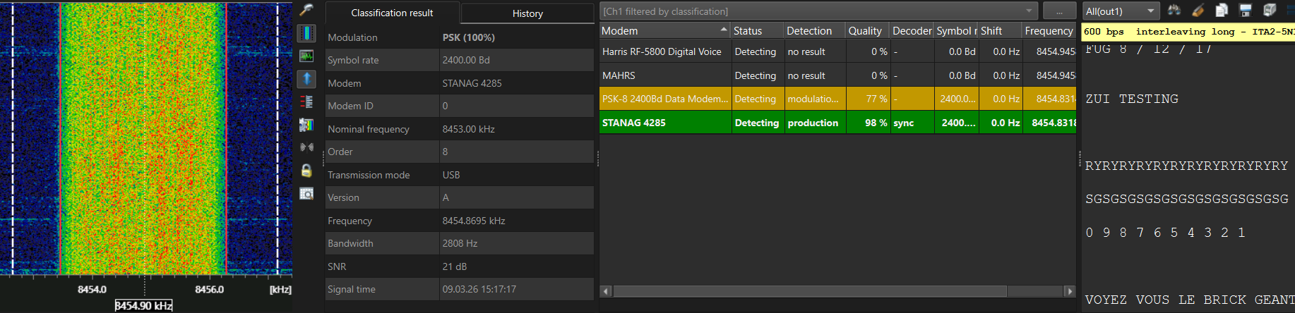 A production channel uses a configurable list of decoder/modems. The correct/best match is selected for decoding. The signal is demodulated, decoded and the results are displayed.